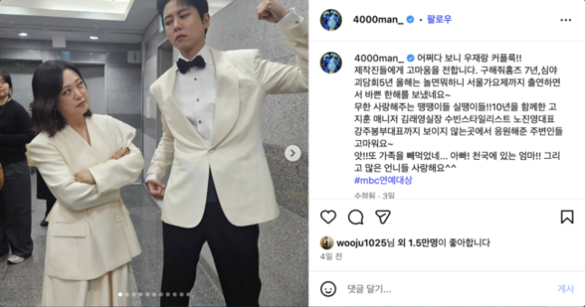 김숙은 “제작진들에게 고마움을 전합니다. 구해줘홈즈 7년,심야괴담회5년 올해는 놀면뭐하니 서울가요제까지 출연하면서 바쁜 한해를 보냈네요~”라며 팬들과 자신의 스태프, 가족들에 고마움을 표했다. 박나래는 해당 게시물에 ‘좋아요’를 누르며 자신을 언급한 김숙에 화답했고, 이는 박나래가 활동중단 후 처음으로 SNS를 통해 근황을 전한 것으로 알려지고 있다.
