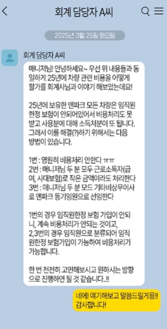 4대 보험 미가입 의혹도 공방이 이어졌다. A 씨는 4대 보험 가입을 요구했지만 무시당했다고 주장했으나, 영상에서는 앤파크 회계 담당자가 A 씨에게 근로 소득으로 급여를 받는 방향을 요청한 카카오톡 내용이 공개됐다. 다만 A 씨가 3.3%만 공제되는 사업 소득 형태를 원했다는 정황도 함께 언급됐다.
