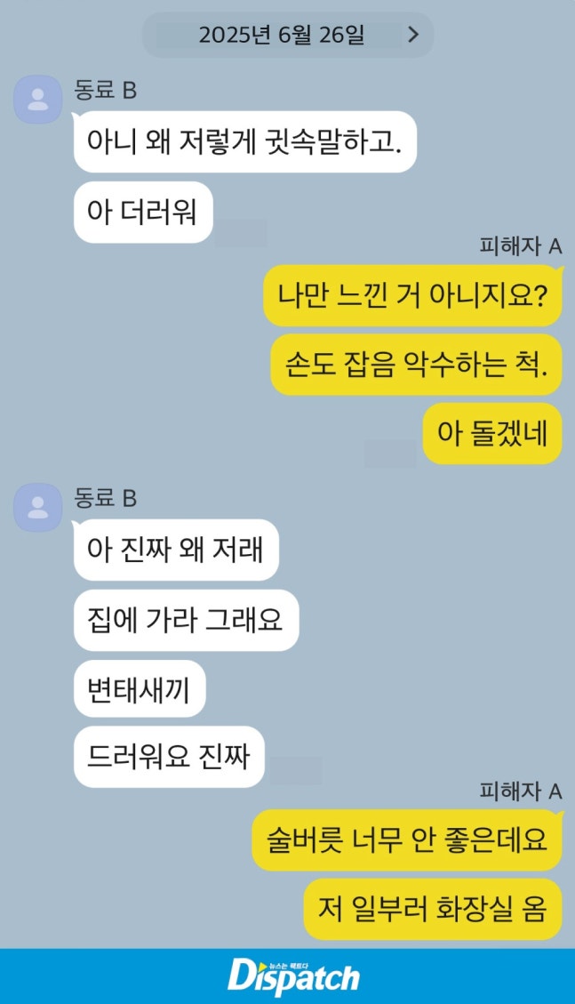 다음은, A씨와 회식 현장에 있던 동료 B씨의 실시간 대화다. 카톡이 오고 간 시각은 2025년 6월 26일 오후 8시 48분. 동료 B씨가 먼저 말을 걸었다.