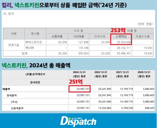 넥스트키친의 매출 대부분 컬리와의 거래에서 발생한다. 지난 2024년 넥스트키친의 매출은 251억 원. 그해 컬리가 넥스트키친에서 매입한 금액은 253억 원이다.