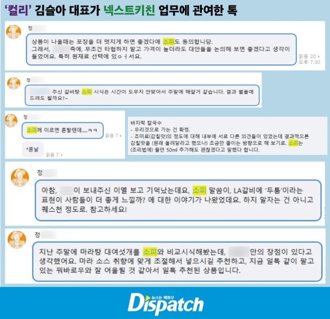 실제로 정 대표는 회사 단체방에 "소피(김슬아 대표)가 주말에 시식했는데 간이 세다고", "소피 말씀이 LA갈비의 두툼이라는 표현이~" 등의 의견을 대신 전했다.