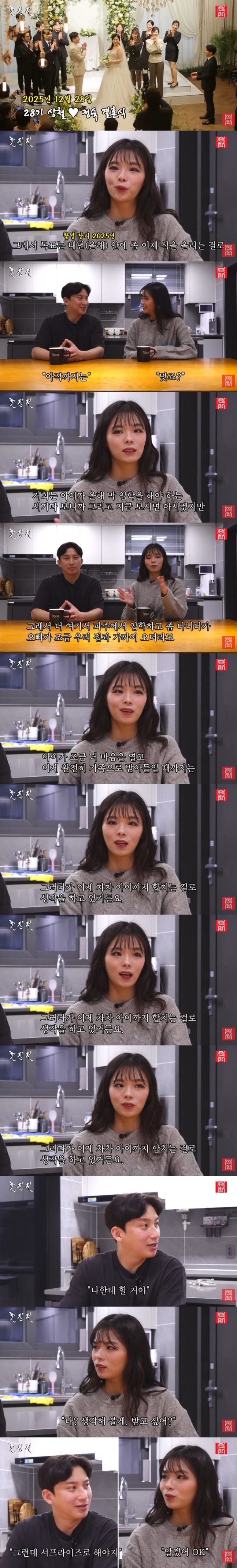 둘의 재혼 계획에 대해 28기 옥순은 "목표는 올해 안에 식을 올리는 걸로 하겠다"면서 이혼 후 홀로 키우던 아이의 상황을 최우선으로 꼽았다.