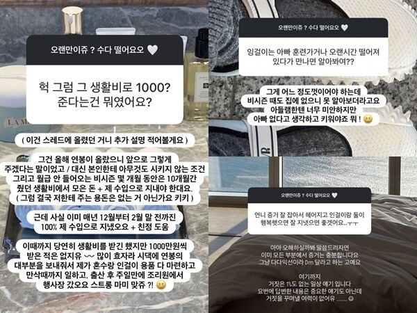 김지연은 25일 오전 자신의 SNS에서 팬들과 질의응답(Q&A) 시간을 갖고, 부부 관계가 원만하지 않다고 밝히며 결혼 생활 중 겪은 갈등을 연이어 언급했다. 그는 생활비 문제와 관련해 “매년 12월부터 2월 말까지는 100% 제 수입과 친정의 도움으로 지냈다”며 “생활비를 받긴 했지만 1000만 원씩 받은 적은 없다”고 주장했다.
