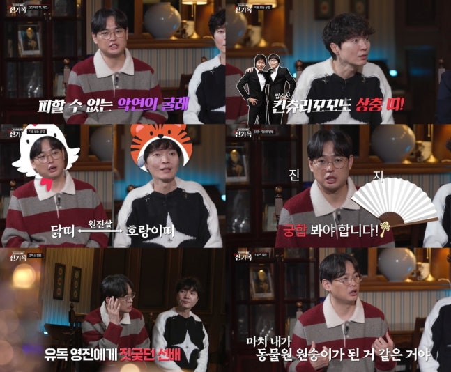 이날 방송에서 띠별 궁합 테스트가 공개돼 눈길을 끈다. 특히 신정환은 과거 컨츄리꼬꼬 시절 함께했던 탁재훈과의 관계에는 정반대 성향으로 만나기만 하면 부딪친다는 이른바 '상충살'이, 현재 호흡을 맞추고 있는 박영진과의 관계에는 서로 미워한다는 '원진살'이 나타나 경악을 금치 못한다. 구러나 원진살은 일명 '사랑살'이라 하여, 쉽게 끊을 수 없는 애증의 관계라는 해석이 더해져 위기를 맞은 두 사람의 관계가 어떻게 변화할지 관심이 쏠린다.