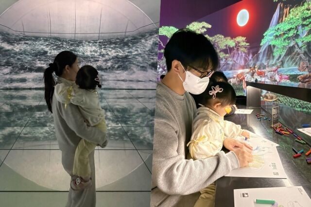 공개된 사진 속에는 이다인이 딸을 품에 꼭 안고 환상적인 미디어 아트 전시를 관람하는 모습이 담겼다. 엄마 품에 얌전히 안겨 신비로운 물결 영상을 응시하는 딸의 뒷모습에서 평화로운 가족의 한때가 느껴진다. 이다인은 임신 중임에도 불구하고 편안한 차림으로 딸과 교감하며 여유로운 시간을 즐겼다.