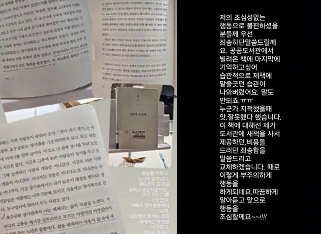김지호는 23일 자신의 SNS를 통해 “저의 조심성 없는 행동으로 불편하셨을 분들께 죄송하다”고 밝혔다. 그는 “공공도서관에서 빌려온 책인데, 제 책에 하던 습관대로 무심코 밑줄을 긋고 말았다”며 “새 책을 구입해 제공하거나 비용을 지불하는 등 책임을 다하겠다”고 덧붙였다.