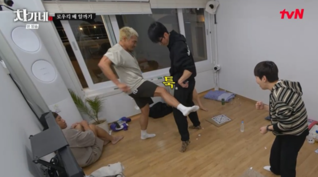 게임 2차전은 알까기 대결로 이어졌다. 패자의 벌칙은 추성훈의 로우킥. 첫 희생자가 된 대니구는 로우킥 한 방에 과장된 리액션으로 쓰러졌고, 딘딘 역시 벌칙을 받으며 현장을 웃음바다로 만들었다. 이어 차승원과 딘딘의 ‘앙숙’ 1대1 대결까지 성사되며 케미를 더했다.