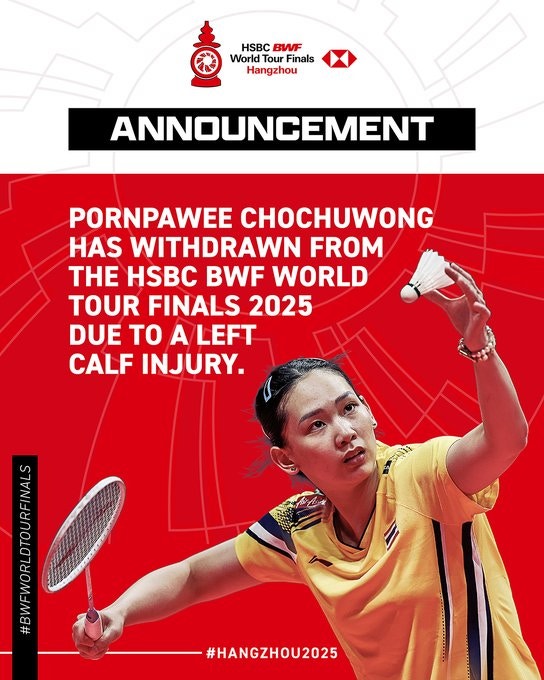 BWF는 18일(한국시간) 공식 홈페이지를 통해 초추웡이 왼쪽 종아리 부상 재발로 인해 월드투어 파이널에서 낙마한다고 발표했다.