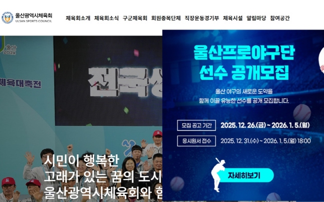 울산광역시체육회 홈페이지 메인 화면에는 현재 '울산프로야구단 선수모집'과 '울산프로야구단 직원채용 공고' 2개의 팝업창이 동시에 떠있다. '자세히보기'를 클릭해 들어오면 상세한 지원방법을 알 수 있다.