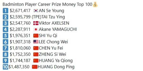 이는 배드민턴 역사상 전례 없는 기록이다. 안세영의 페이스와 나이 등을 종합적으로 고려할 때 추후 누적 상금 측면에선 타의 추종을 불허하는 압도적인 기록을 수립할 전망이다.