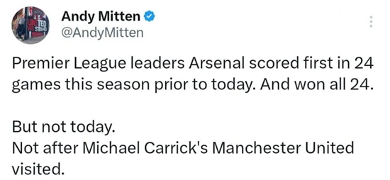 그러나 이 견고한 공식은 맨유 앞에 무너졌다. 미튼은 "하지만 오늘은 아니었다. 마이클 캐릭의 맨체스터 유나이티드가 방문한 뒤로는 그 기록이 유효하지 않게 됐다"고 전했다.