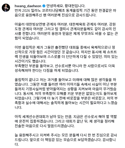 황대헌은 "올림픽 이후 과거를 돌아보고 미래에 대해 많은 생각을 했다"며 "나를 둘러싼 이야기 중 사실이 아닌 부분들이 기정사실처럼 받아들여지는 상황을 보며 마음이 무거웠다"고 밝혔다.