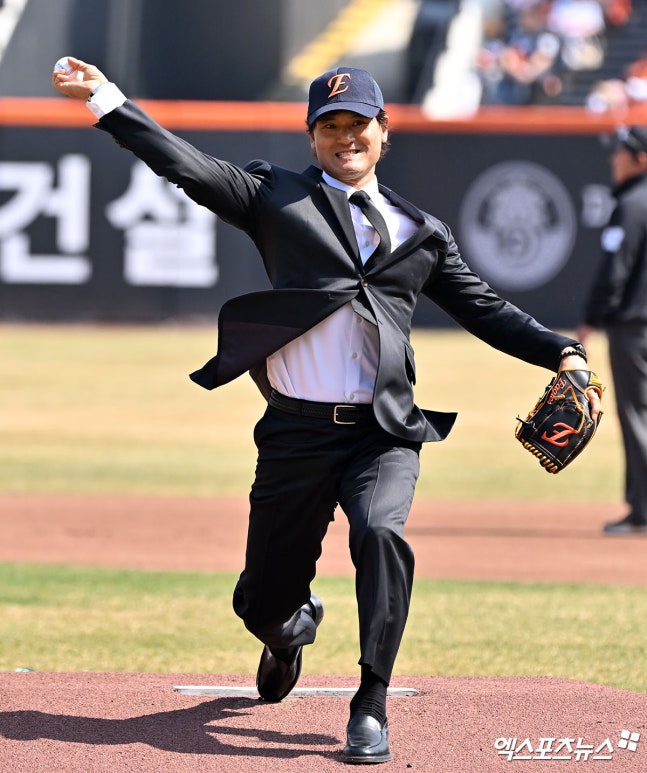 (엑스포츠뉴스 대전, 김근한 기자) '코리안 특급' 박찬호가 2026시즌 한화 이글스 홈 개막전에서 의미 있는 시구를 던졌다. 박찬호는 최근 많은 사상자가 나왔던 대전 화재 사고 희생자들의 명복을 빌고자 검은 양복을 입고 마운드에 올랐다.