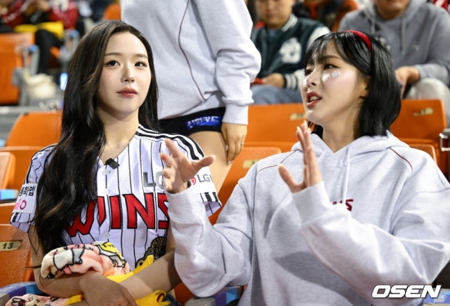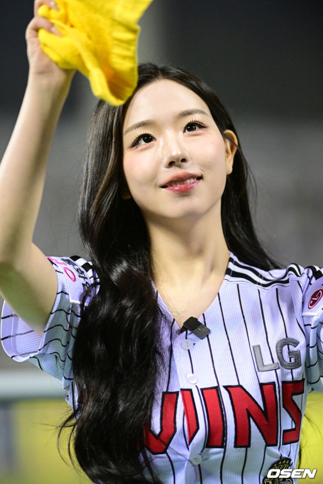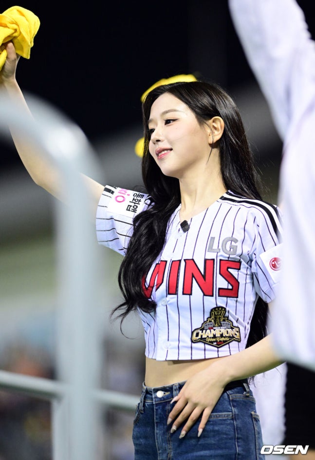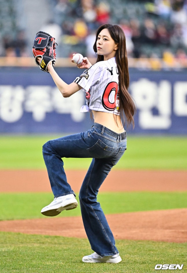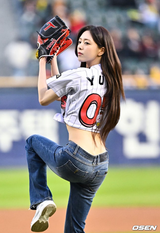 이틀 연속 ‘아이돌 시구=승리 공식’이 이어졌다. 유나와 김채연은 나란히 LG 유니폼 상의를 리폼해 개미 허리를 내보이는 패션과 데님 팬츠 차림으로 멋진 시구를 보여줬다