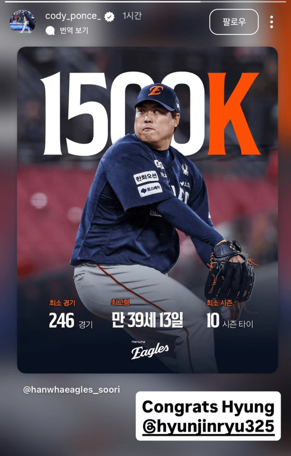 그런데 심지어 미국에서도 축하의 메시지가 날아왔다. 그 주인공은 코디 폰세(토론토 블루제이스)였다. 지난해 한화에서 한솥밥을 먹은 팀메이트이자, 오랜 류현진의 '열혈팬'으로도 유명한 이름이다.
