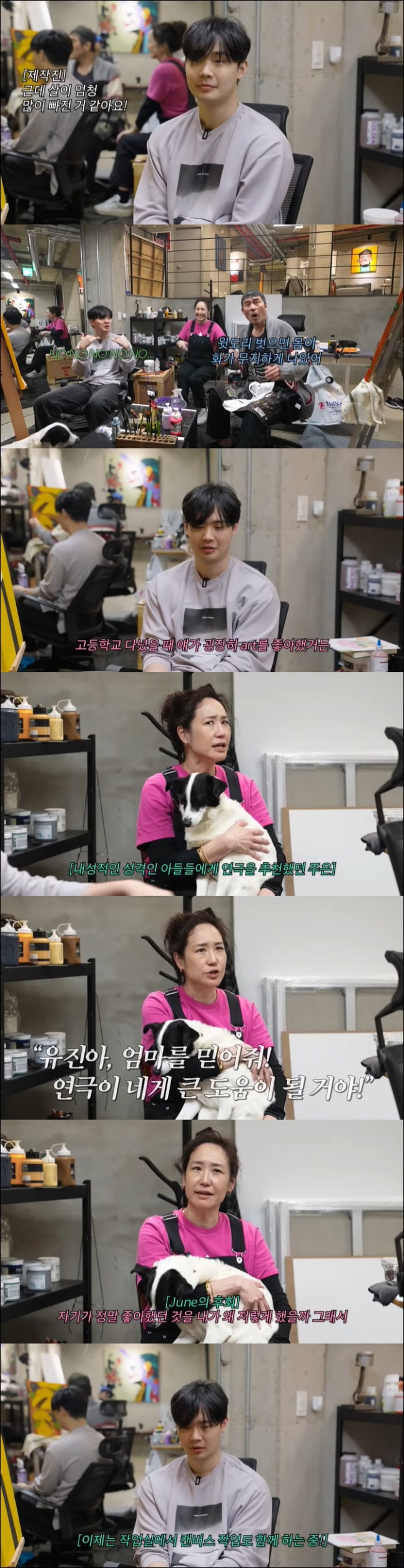 유진 군이 미술을 시작한 계기에 대해 강주은은 "예전부터 너무 미안한데 고등학교 다녔을 때 얘가 미술을 좋아했다. 내가 원래 이런 스타일이 아니다. 아들이 원하는, 자기 재능대로 따라가는 걸 지원하는 부모인데 당시 연극을 할 건지 미술을 할지 고민이었다. 얘가 미술을 좋아하는데 내가 연극하는 걸 굉장히 밀었다"고 털어놨다.