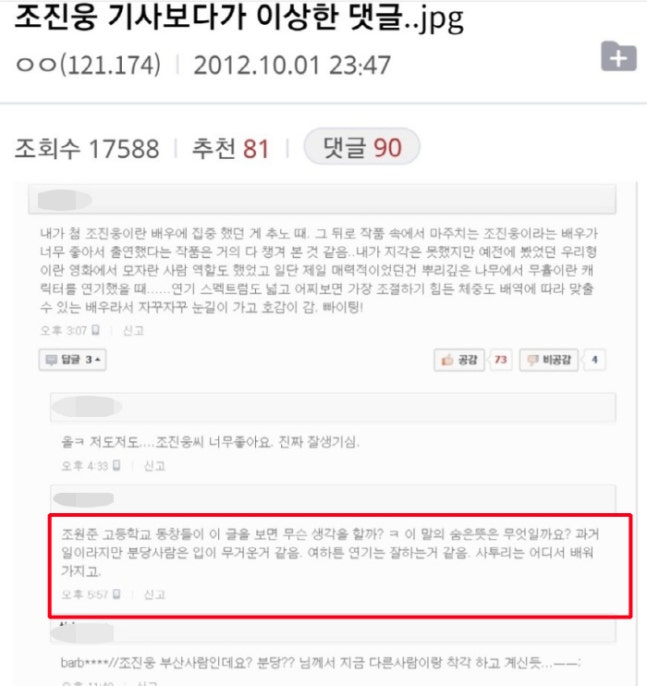 또 다른 2012년 댓글도 파묘됐다. 조진웅이 단역을 맡을 때 팬이 됐다는 댓글에 한 네티즌은 "조원준 고등학교 동창들이 이 글을 보면 무슨 생각을 할까? 이 말의 숨은 뜻은 무엇일까요? 과거 일이라지만 분당 사람은 입이 무거운 것 같음. 여하튼 연기는 잘 하는 거 같음. 사투리는 어디서 배워가지고"라며 의미심장한 댓글을 달았다.