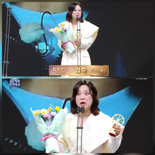 수상 소감을 마친 뒤 김숙은 “‘구해줘! 홈즈’ 팀이 섬 매물을 무서워한다”며 “제가 섬 매물을 직접 보러 가겠다. 주우재와 함께 가겠다”고 공약을 덧붙이며 분위기를 환기시켰다. 또 “30년 동안 매일 그만두겠다고 했는데도 잡아주신 유재석 선배님, 송은이 대표님, 이영자 언니에게 감사드린다”며 고마움을 전했다.