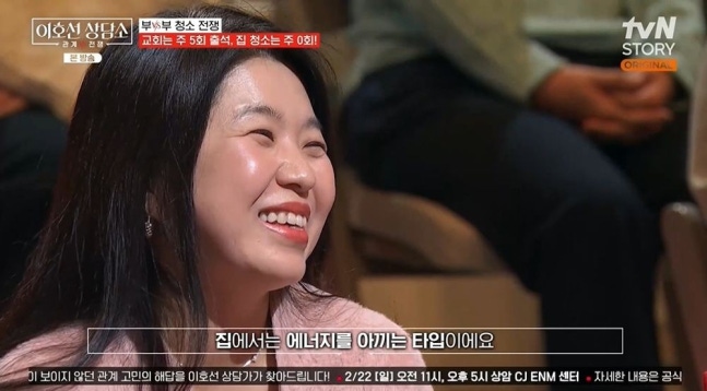 아내는 교회는 왜 가냐는 질문에 "교회 가면 저에게 기쁨이 넘친다"라며 또 웃었다. 이호선은 "기쁨이 어디 있는지 중요한 지점이다"라며 "아이들은 안 기쁘냐"고 물었다. 그러자 아내는 "아이들과 저의 사이는 좋다. 남편 혼자 만족을 못하는 것"이라고 했다.