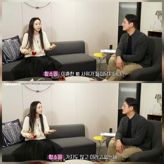 4일 MBN 예능 프로그램 ‘속풀이쇼 동치미’ 선공개 영상에는 함소원이 정신건강의학과 전문의 이광민과 상담을 나누는 모습이 담겼다. 함소원은 “2022년 12월 이혼을 마친 뒤 2023년 베트남으로 갔는데, 진화 씨가 찾아와 함께 살게 됐다”며 “친정엄마와 딸 혜정이까지 네 사람이 한집에 살았다”고 밝혔다.