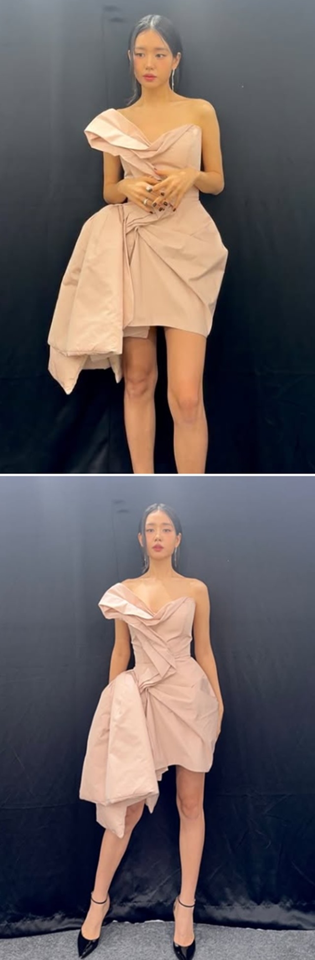 공개된 사진 속 안은진은 연한 핑크 톤의 원숄더 미니 드레스를 입고 우아한 자태를 드러냈다. 차분하게 묶은 로우 포니테일과 자연스러운 메이크업이 어우러지며 성숙한 분위기를 자아냈다. 특히 이전보다 또렷해진 얼굴선과 정돈된 실루엣이 눈길을 끈다.