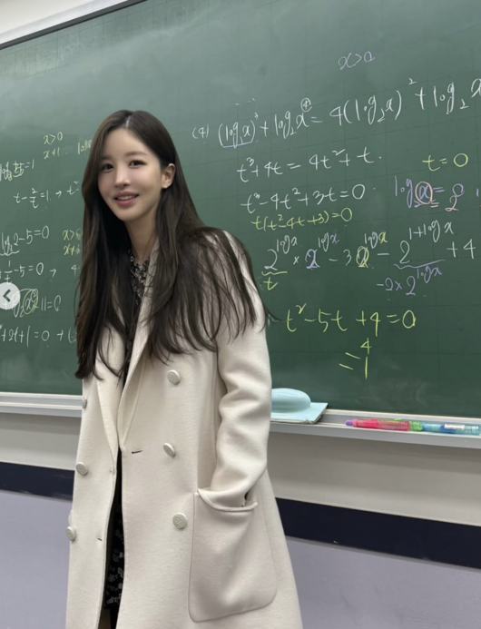 사진 속 그는 수학 공식이 빼곡히 적힌 칠판 앞에 서 있는 모습. 로그와 방정식이 적힌 교실 배경 속에서 단정한 아이보리 코트를 걸친 채 환한 미소를 짓고 있어 눈길을 끈다. 긴 생머리와 또렷한 이목구비, 차분한 분위기가 여배우같은 분위기를 자아낸다.