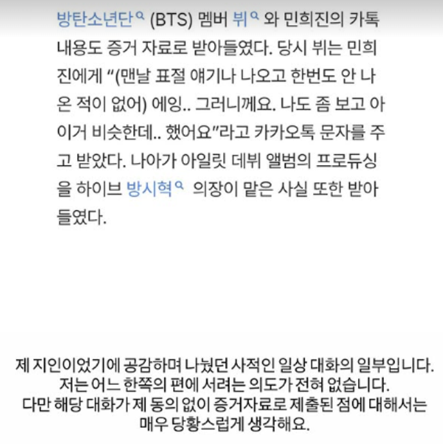 그룹 방탄소년단 멤버 뷔(본명 김태형)가 민희진 전 어도어 대표와 나눈 카카오톡 대화가 법정 증거로 채택된 것과 관련해 직접 입장을 밝혔다.