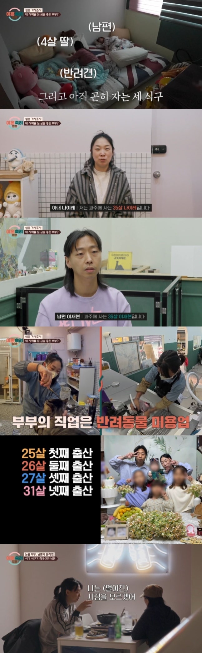 19기 '눈물 부부'의 가사조사도 진행됐다. 남편과 함께 애견 미용일까지 병행하는 아내는 딸 넷의 육아와 살림을 도맡아했다.