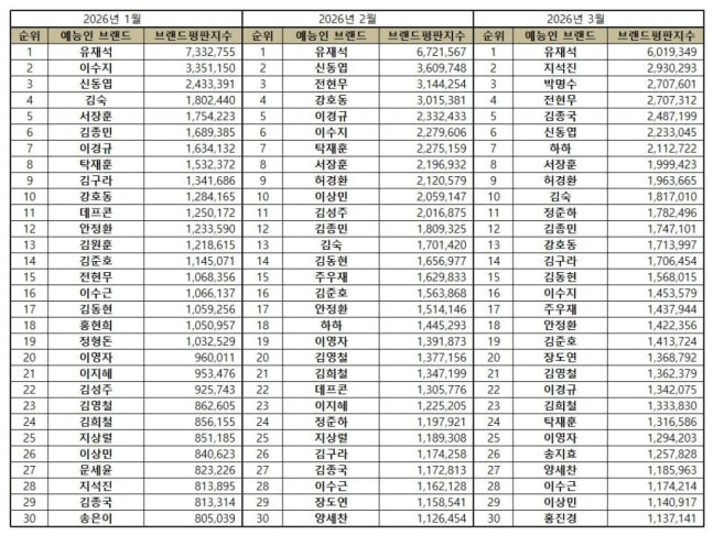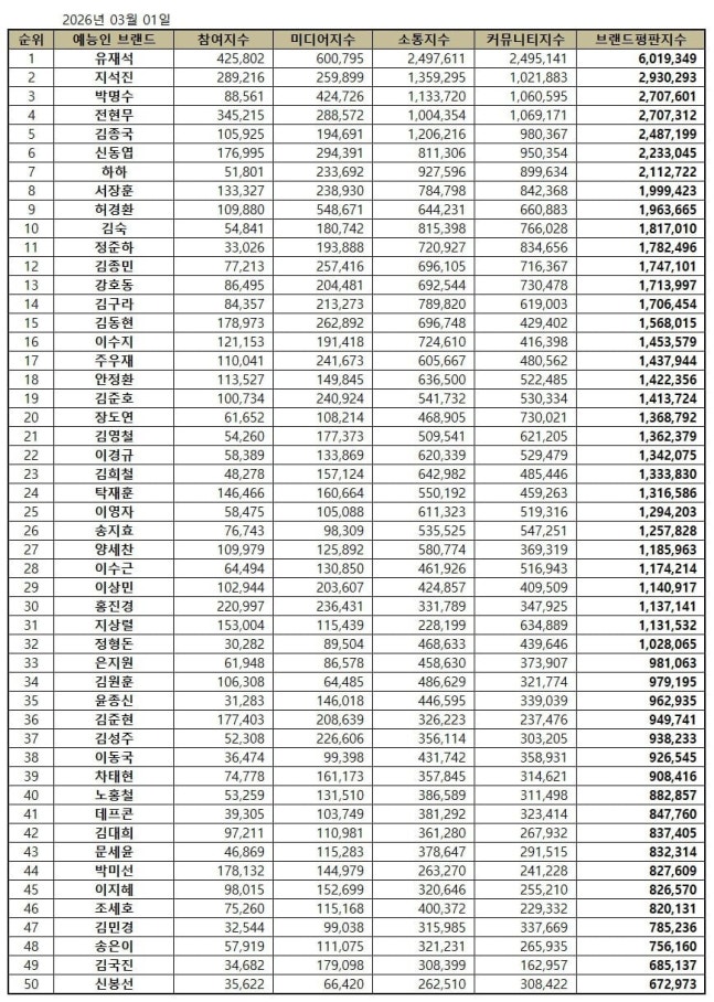 한국기업평판연구소는 2026년 2월 1일부터 2026년 3월 1일까지의 예능방송인 50명의 브랜드 빅데이터 72,717,089개를 분석하여 소비자들의 예능 방송인 브랜드 참여량, 미디어량과 소비자의 참여와 소통량, 소셜에서의 대화량을 측정했다. 지난 2월 예능방송인 브랜드 빅데이터 75,094,290개와 비교하면 3.17% 줄어들었다.