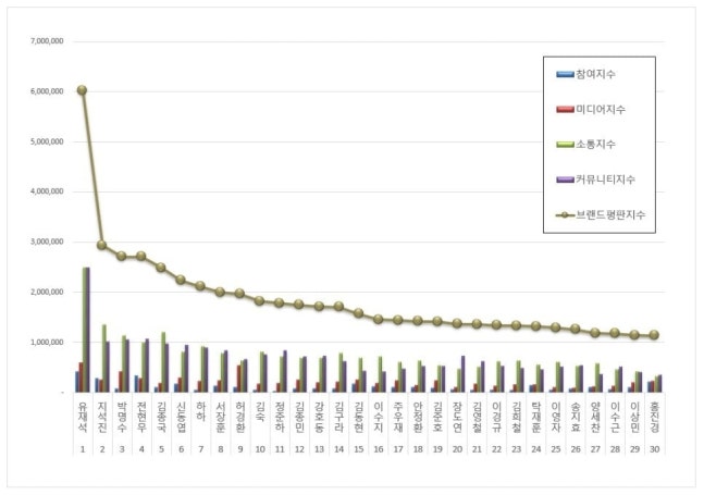 예능방송인 브랜드평판 1위를 기록한 유재석 브랜드는 참여지수 425,802 미디어지수 600,795 소통지수 2,497,611 커뮤니티지수 2,495,141이 되면서 브랜드평판지수 6,019,349로 분석됐다. 지난 2월 브랜드평판지수 6,721,567과 비교해보면 10.45% 하락했다.