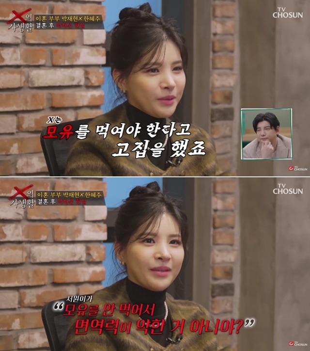 이날 한혜주는 결혼 후 힘들었던 순간을 고백했다. 그는 “아기를 낳고 얼마 안 됐을 때 과호흡이 와 숨이 막혀 죽을 것 같았다”며 “그런데도 박재현이 ‘모유를 먹어야 건강하다’며 모유 수유를 고집했다”고 말했다.