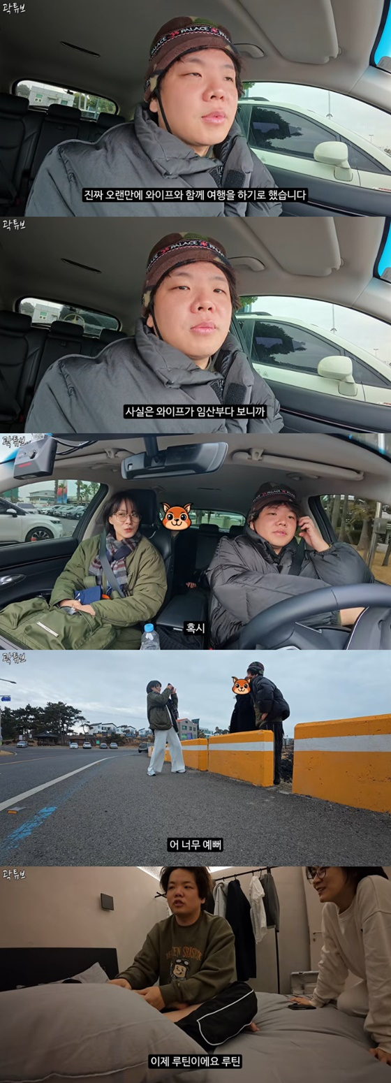 아내가 출산하기 전 영상을 촬영한 곽튜브는 "진짜 오랜만에 와이프와 함께 여행을 가기로 했다. 와이프가 임산부다 보니까 나랑 해외여행 같이 가기도 좀 그렇고, 몸도 좀 안 좋고 그랬다"며 "이번에 주말 껴서 제주도에서 만나서 여행을 하기로 했다"고 말했다.