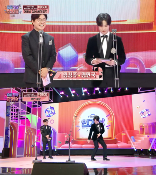 뿐만 아니라 김민국은 즉석으로 무대 위에서 마이클잭슨의 문워크를 선보이는 것은 물론, 수상자 발표에도 아버지 김성주의 조종에 맞춰 수상자 이름을 외쳐 시청자들에 웃음을 전했다.