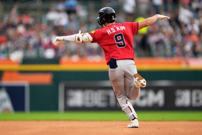 [디트로이트=AP/뉴시스]메이저리그(MLB) 애틀랜타 브레이브스의 김하성이 21일(현지 시간) 미국 미시건주 디트로이트의 코메리카 파크에서 벌어진 2025 MLB 디트로이트 타이거스와의 원정 경기에 6번 타자 유격수로 선발 출전해 4회초 솔로 홈런을 폭발한 뒤 그라운드를 달리고 있다. 2025.09.22.