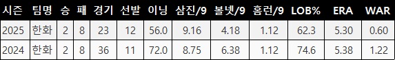 특히 후반기 체력 저하로 인한 성적 하락(2025 후반기 ERA 8.72)과 단조로운 투구 패턴이 약점으로 지적됐다. 선수 본인 역시 자신의 투구가 첫 시즌에 비해 전반적으로 크게 달라지지 않았고 잘하다가도 금방 꺾였다며 지난 시즌을 냉정히 복기했다.