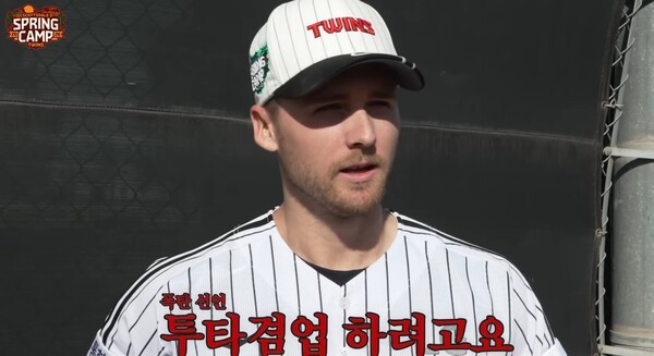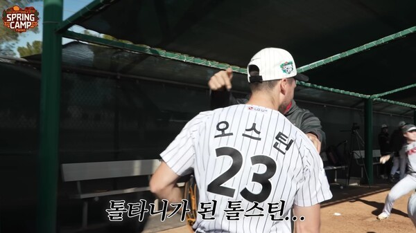지난 29일 LG 트윈스 공식 유튜브 채널에는 외인 투수 앤더스 톨허스트의 불펜피칭 영상이 공개됐다. 그런데 영상 속 톨허스트는 자신의 유니폼이 아닌 '거포' 오스틴 딘의 유니폼을 입고 등장해 눈길을 끌었다. 마치 타자 오스틴이 투수로 마운드에 오른 듯한 모습은 자연스럽게 '투타 겸업'을 연상케 했다.