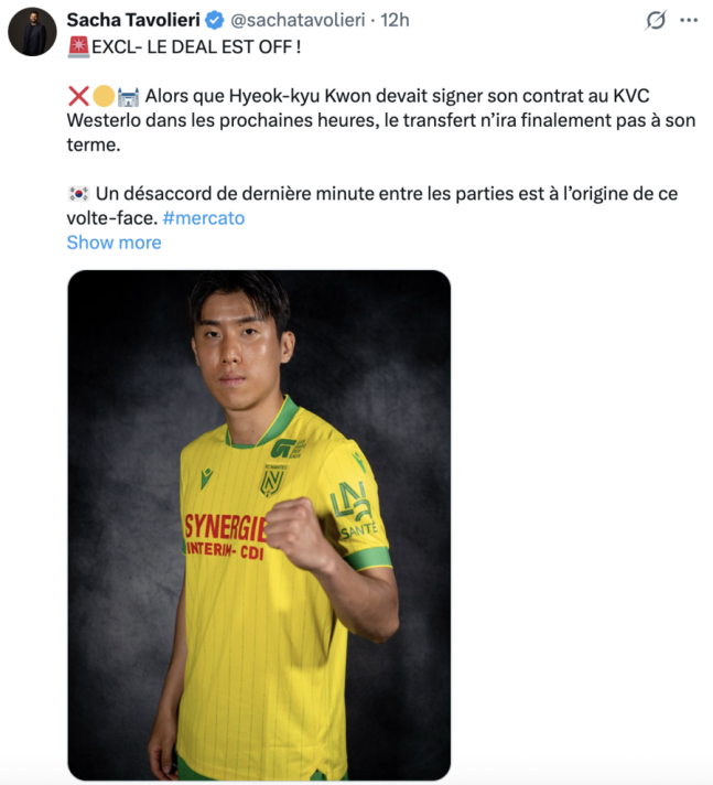 벨기에 매체 '헤트 니우브블라드(Het Nieuwsblad)가 30일(한국시간) "권혁규는 결국 베스테를로에 이적하지 않게 됐다. 그는 거래를 마무리하기 위해 29일 저녁 벨기에에 도착할 예정이었으나, 선수와 구단 간에 끝내 합의점을 찾지 못했다"라고 보도했다.