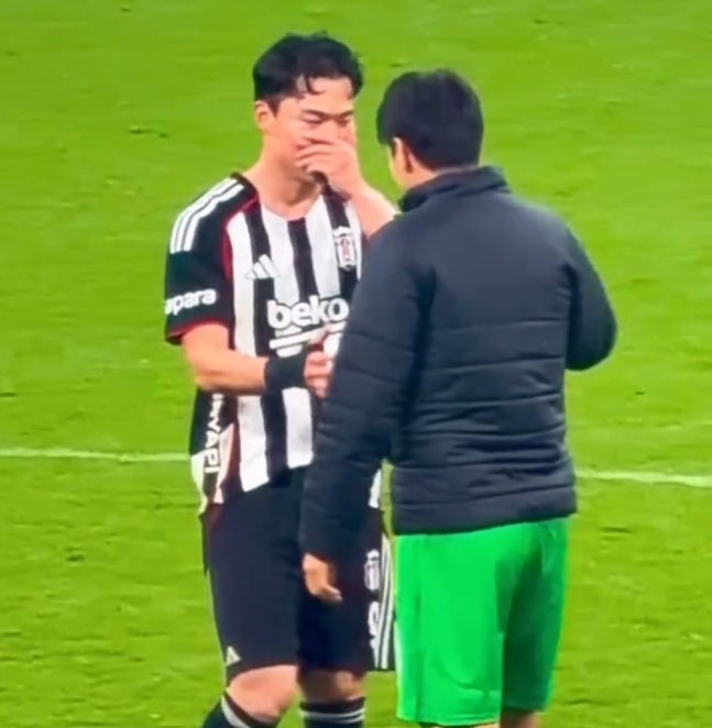 [인터풋볼=박윤서 기자] 오현규와 황의조가 인사하는 모습이 중계 카메라에 포착됐다.