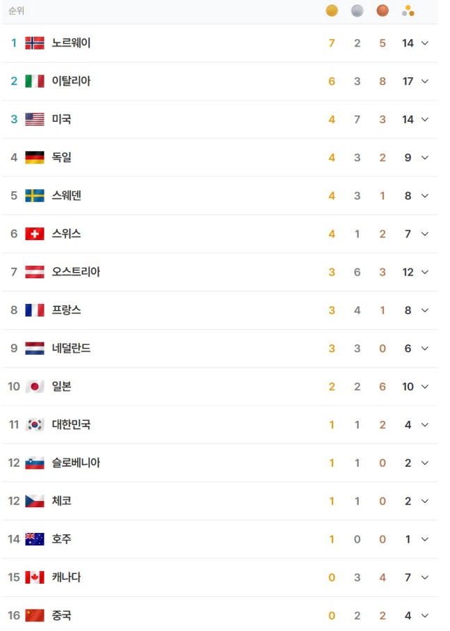 반면 '14억 인구' 중국은 굴욕이다. 전날까지 중국은 은1, 동2로 대한민국에 앞섰다. 대한민국은 이날 새벽 최가온과 쇼트트랙 남자 1000m에서 임종언(고양시청)이 동메달을 목에 걸며 단숨에 전세를 뒤집었다. 금메달이 없는 중국은 16위(은2, 동2)로 추락했다.