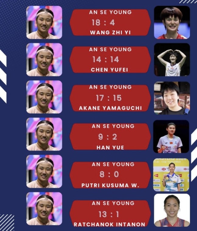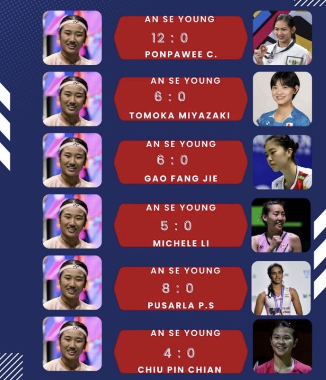 안세영은 세계랭킹 8위 포른파위 초추웡(태국)부터 미야자키 도모카(일본), 가오팡제(중국), 미셸 리(캐나다), 푸살라 신두(인도), 치우 핀 치안(대만)과의 경기에서 단 한 번도 패배하지 않았다. 포른파위의 경우 안세영과 12번 맞붙었지만 안세영에게 전패했다. 다른 선수들도 안세영과의 상대전적에서는 0-8, 0-6, 0-5 등 절망적인 기록을 보유하고 있다.