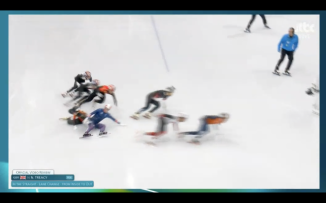 레이스 중반 트레이시가 갑작스레 넘어지면서 류사오앙을 덮쳤고, 이 여파로 쑨룽까지 함께 충돌하고 만 것. 쑨룽은 아예 경기를 포기해야 했다. 그는 다른 선수의 스케이트 날에 무릎을 베여 출혈이 발생했고, 결국 레이스를 포기한 뒤 빙판 중앙으로 이동했다