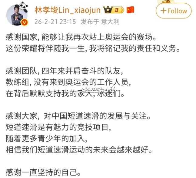 린샤오쥔은 지난 23일 폐막한 2026 밀라노·코르티나 동계올림픽의 쇼트트랙 일정이 끝난 뒤 8년 만에 올림픽에 출전한 소감을 전했다.