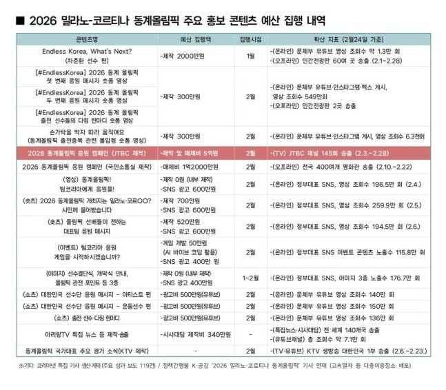 그는 정부가 이번 올림픽 콘텐츠 홍보로 약 7억원 예산을 집행한 내역을 공개하며 "SNS 콘텐츠가 홍보 핵심 수단으로 부상했는데 여전히 소극적 홍보를 하고 있다"고도 지적했다. 진종오 의원실이 문체부를 통해 확보한 '2026 동계올림픽 홍보 주요 콘텐츠 세부내역' 자료에 따르면, 정부는 1~2월 동안 영상 제작 및 매체 집행비로 자료 기준 총 7억310만원을 사용했다. (연관 기사 『[단독] 진종오 "정부, JTBC에서만 나오는 콘텐츠에 올림픽 홍보 예산 몰아줘"』)