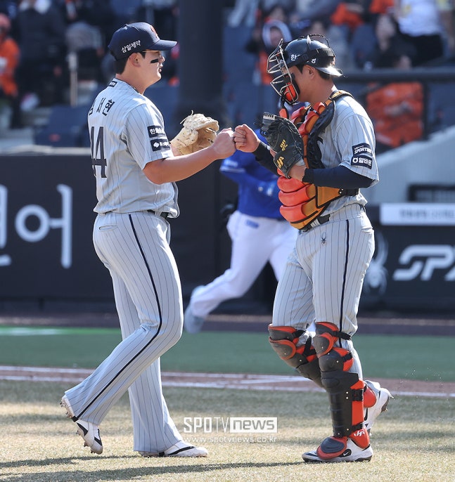 이날 시범경기 첫 등판에 나선 김서현은 9회초 마운드에 올랐다. 김영웅의 대타 김헌곤을 4구 만에 헛스윙 삼진으로 돌려세웠다. 슬라이더를 적극적으로 활용했다. 심재훈에겐 포심 패스트볼로 승부했다. 3구째에 2루 땅볼을 유도해 아웃시켰다. 이어 김재성과의 맞대결에선 주로 체인지업을 썼다. 5구째에 김재성의 방망이가 헛돌며 경기가 종료됐다.