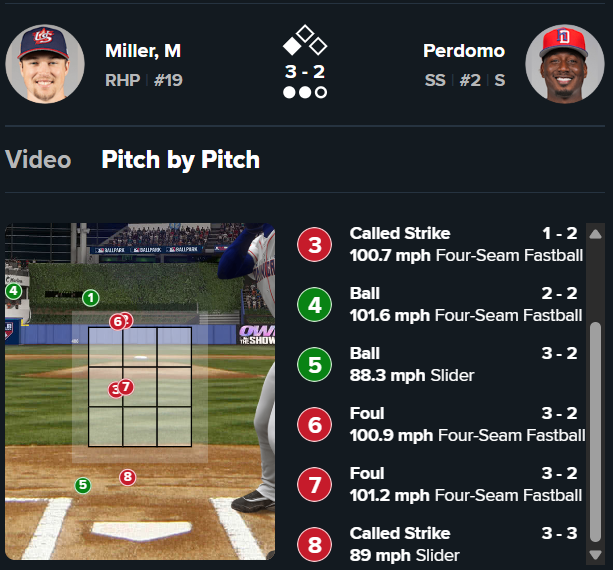 이어 타석에 선 도미니카공화국 타자는 헤랄도 페르도모였다. 밀러는 페르도모와 풀카운트 접전 끝에 8구째 슬라이더를 던졌다. 주심이 이 슬라이더를 스트라이크로 판정해 삼진 아웃으로 경기가 끝났다. 볼넷인 줄 알고 출루하려던 페르도모는 매우 큰 아쉬움을 표했다.