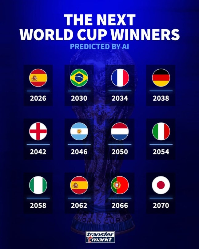 당시 얻은 교훈을 바탕으로 다가오는 2026 북중미 월드컵에서는 8강 이상이 목표다. 이러한 상황 속 축구 통계 매체 '트랜스퍼마크트'가 다가올 월드컵 우승팀을 예상했다. 우선 북중미 월드컵에서는 스페인이 정상에 오를 것이라고 예측했고, 이어 2030 월드컵에서는 브라질이 우승컵을 차지할 것이라고 전망했다. 일본은 2050년이 아닌 2070년에 월드컵 우승 가능성이 있다고 바라봤다.