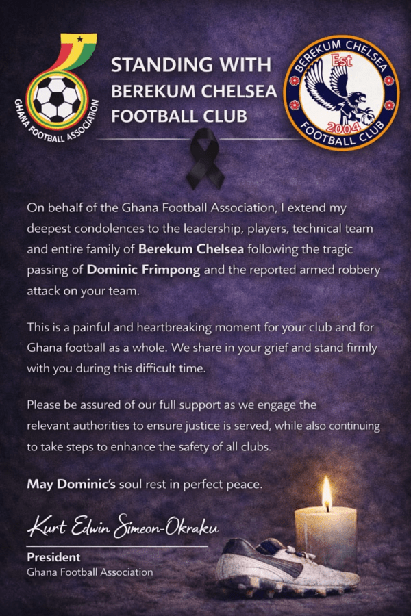 미국 매체 '디애슬레틱'은 13일(한국시간) "가나 출신의 도미닉 프림퐁이 원정 경기를 마치고 돌아오던 중 팀 버스가 무장 강도의 습격을 받았고, 끝내 숨을 거두는 비극이 발생했다"고 보도했다.