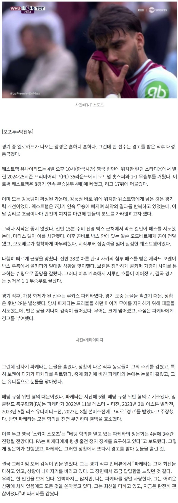 흔하디 흔한 옐로카드 받고서 '눈물 펑펑' 대성통곡…이유는 '베팅 혐의→평생 출전 정지 위기'