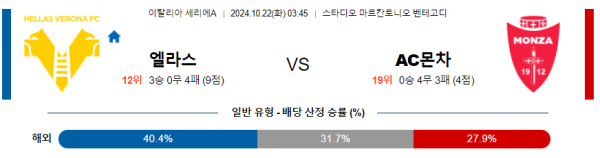 10월22(화) 03:45세리에A엘라스:AC 몬차 축구분석자료