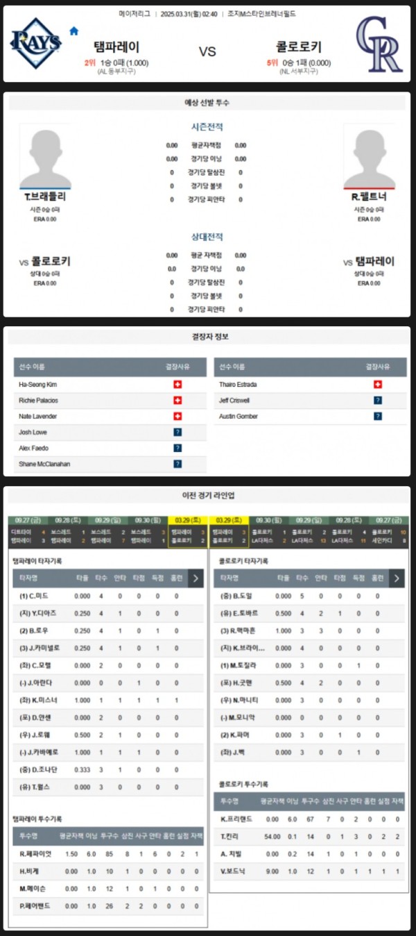 두 팀의 최근 맞대결 기록을 보면, 탬파베이는 콜로라도 로키스를 상대로 4승 0무 2패로 우위를 점하고 있습니다. 특히 홈과 원정에서의 득점력이 안정적이며, 수비적인 측면에서도 상대를 효과적으로 제어하고 있음을 알 수 있습니다.